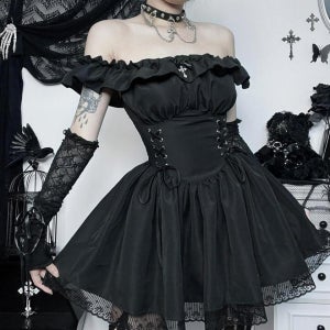 고딕 고스룩 오프숄더 레이스 고스로리 공주풍 지뢰계 미니 드레스