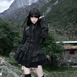 고스로리 고딕원피스 블랙 레트로 프릴 레이스업 셔링 슬림핏 가을 공주풍 미니 원피스
