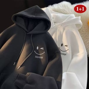 Asure 봄 가을 루즈핏 캐주얼 무지 스마일 패턴 후드 얇은 기모 맨투맨 1+1 블랙+화이트 L