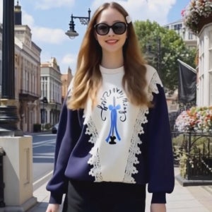 사랑스러운걸 네이비 V배색 레이스 트리밍퍼프 소매 루즈핏 기모 맨투맨[겨울 라운드 시보리 박시 박스 본딩 면 도톰한 따뜻한 방한 배색 데일리룩 여행룩 고급 브랜드 명품 원단 보세