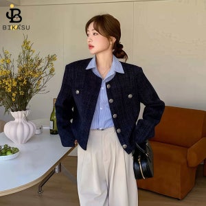 BIKASU 여성 긴팔 라운드넥 트위드자켓 클래식 빅사이즈 고급 숏 모직 코트 네이비 L