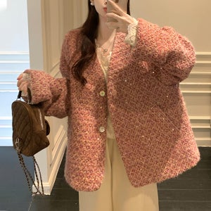 오버핏 빅사이즈 러블리 스팽글 트위드 자켓 겨울아우터 노카라 누빔 연말룩 격식룩